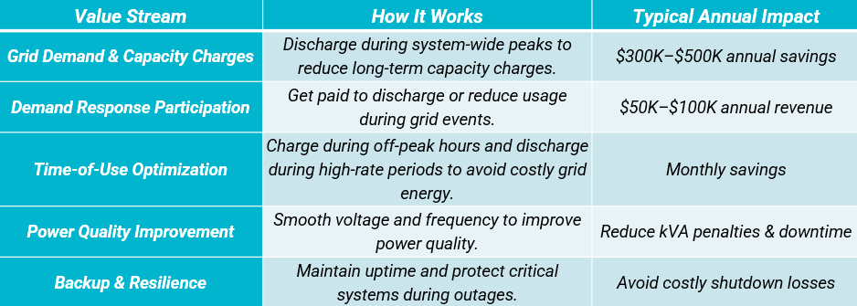 A Battery Energy Storage System creates multiple layers of financial and operational value.